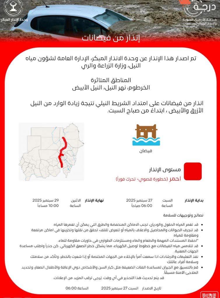متابعات – نبض الوطن – أصدرت وحدة الإنذار المبكر للإدارة العامة لشؤون مياه النيل، وزارة الزراعة والري اليوم إنذاراً باللون الأحمر من خطورة قصوى في كل من الولايات التالية: النيل الأبيض والخرطوم ونهر النيل، حيث يُتوقع فيضانات على امتداد الشريط النيلي نتيجة لزيادة الوارد من النيل الأزرق والأبيض.