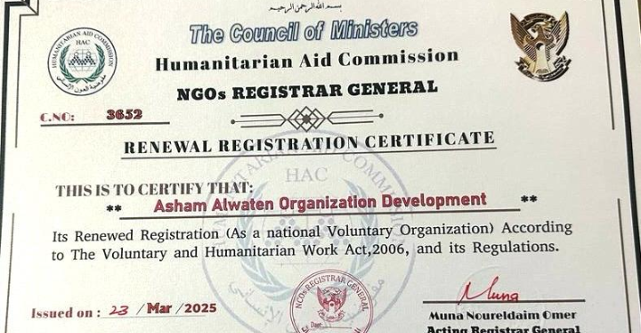اعتمدت مفوضية العون الإنساني بالسودان ،منظمة عشم الوطن للتنمية كواحدة من المنظمات الوطنية السودانية التي يمكنها المساهمة في إعادة الإعمار وتقديم الخدمات الإنسانية للمواطن .