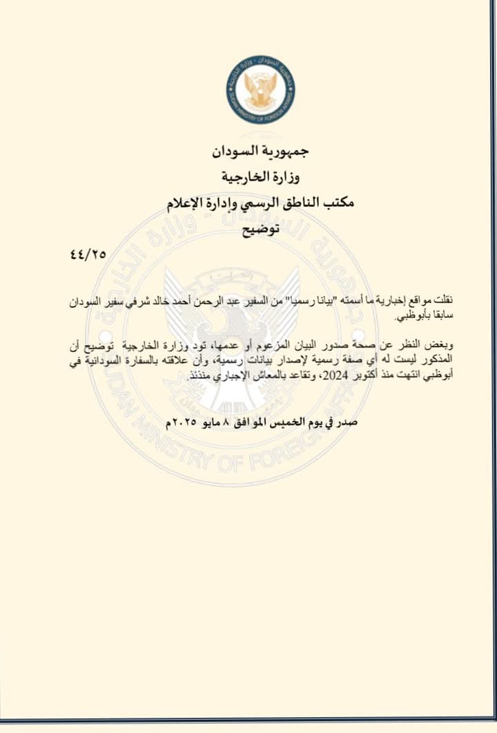 أعلنت وزارة الخارجية السودانية أن السفير عبد الرحمن شرفي ليست له أي صفة رسمية لاصدار بيانات رسمية باسم سفارة السودان بدولة الإمارات .