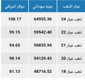 والجدول ادناه يوضح اسعار عيارات الذهب في السودان مقارنةومع اسعاره عالميا والتي بلغ سعر الجرام من عيار 21 حوالي 109 دولار حسب ما يتم تداوله في البورصة العالمية